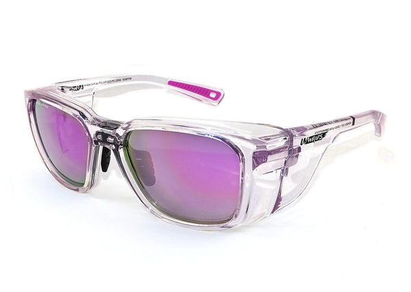 Safety, comfort and style at a great price from our friends at UV Wraps - affordable certified AS/NZS1337.1 eye protection in the new 1839 lightweight clear polycarbonate frame with a pink revo mirror and pink rubber grip tabs. Medium impact rated smoke-greypolarised polycarbonate safety lenses.